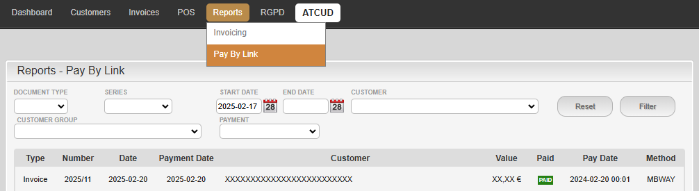 3. Report: You have available, in the Reports menu of your account, a list that you can consult with the generated links and the payment status of each invoice with generated links.
